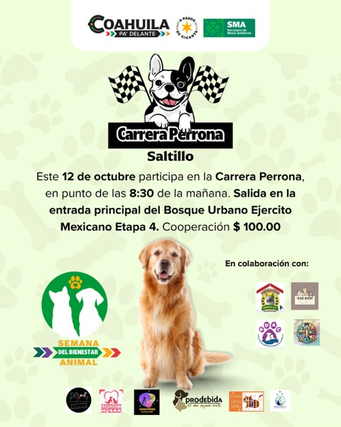 Saltillo, Coahuila de Zaragoza; 9 de octubre de 2025.- El Gobierno del Estado de Coahuila de Zaragoza, a través de la Secretaría de Medio Ambiente, invita a todas las familias coahuilenses a participar en la Feria de los Animales, que se llevará a cabo el domingo 12 de octubre de 2025 en el Bosque Urbano Ejército Mexicano, Etapa 4 (Aviones), en Saltillo, a partir de las 10:00 de la mañana; así como en las Carreras Perronas que se efectuarán de manera simultanea en 8 municipios.