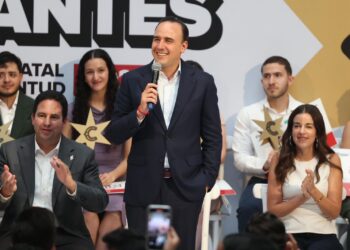 Saltillo, Coahuila de Zaragoza; a 23 de septiembre de 2025.- El gobernador Manolo Jiménez Salinas, acompañado por Paola Rodríguez López,...