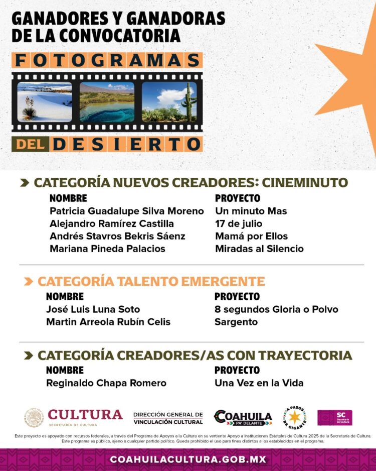 “Fotogramas del Desierto” tiene como objetivo estimular la producción artística audiovisual en Coahuila y abrir un espacio de reflexión y exhibición a través de la cinematografía. En esta edición se otorgó una bolsa de 335 mil pesos distribuida en tres categorías: Creador/a con Trayectoria, Talento Emergente y Nuevos Creadores. Los proyectos seleccionados desarrollarán sus carpetas cinematográficas entre septiembre y noviembre, y se presentarán en tres exhibiciones abiertas al público en diciembre en las ciudades de Saltillo, Monclova y Torreón.