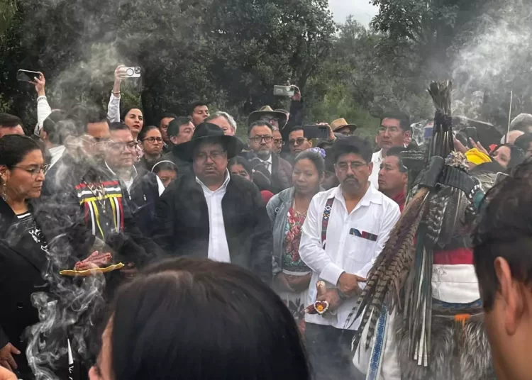 Vestido con una guayabera blanca bordada con motivos florales, rodeado de incienso y acompañado por representantes de comunidades originarias, Aguilar Ortiz —abogado indígena— encabezó la ceremonia de consagración de los bastones de mando en el Centro Ceremonial Cuicuilco, al sur de la capital.